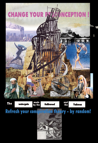 Nos, ez a fajta űr vagy bizonytalanság egy kreatív szituáció, és talán itt lehet egy kis szerepe a művészetnek. Néhány éve készítettem el a Konspiráció-teória generátort, ami az abszurdnak pont ezzel a fajtájával foglalkozik. Ez a mű tulajdonképpen egy montázsgép.
