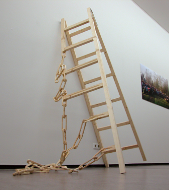 A rizómia, amit korábban szóba hoztál, ezen a ponton válik érdekessé. A művészet, amit csinálok, hosszú-hosszú időkön át terjeszkedik, különböző szárakat növeszt, így épül fel. De az objektjeim, az installációim is így épültek. Hosszú évek telnek el, amíg rájövök, hogy egy-egy dologgal mit is lehet kezdeni. A láncos létra munkám (Extending Evolution) jó példa erre. Gyerekkoromban egy erdélyi úton láttam egy 48-as rab által készített, fából faragott láncot. Megfogott a tárgy ötletessége és a kivitelezés nehézsége, és éreztem, hogy egyszer ez még visszaköszön nálam.