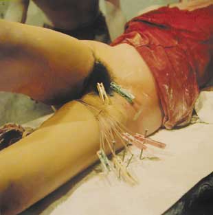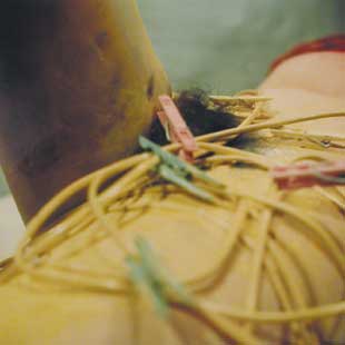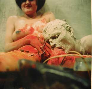 Pontosan mondva: Pollock és a bécsi akcionizmus között ott van a töréspont, ahol fotográfia és a közönség között. Az a gyakran kissé eltúlzott közvetlenség, amellyel nekiláttunk, természetesen a tévedéseket sem zárta ki. Errõl a leginkább én tudnék mesélni. Kísérletet tettem a „valóság” megzabolázására, és belebuktam – talán éppen csak hogy. Milyen ostoba tévedés volt a tanácstalan kritikusok részérõl, amikor azt állították, hogy mi a „mûvészetnek” akartunk véget vetni. Én csak a nyelvet akartam kiírni magamból. Soha nem voltam a rajz, az írás ellen. Testem megkísérelte hieroglifaként kifejezni magát.
