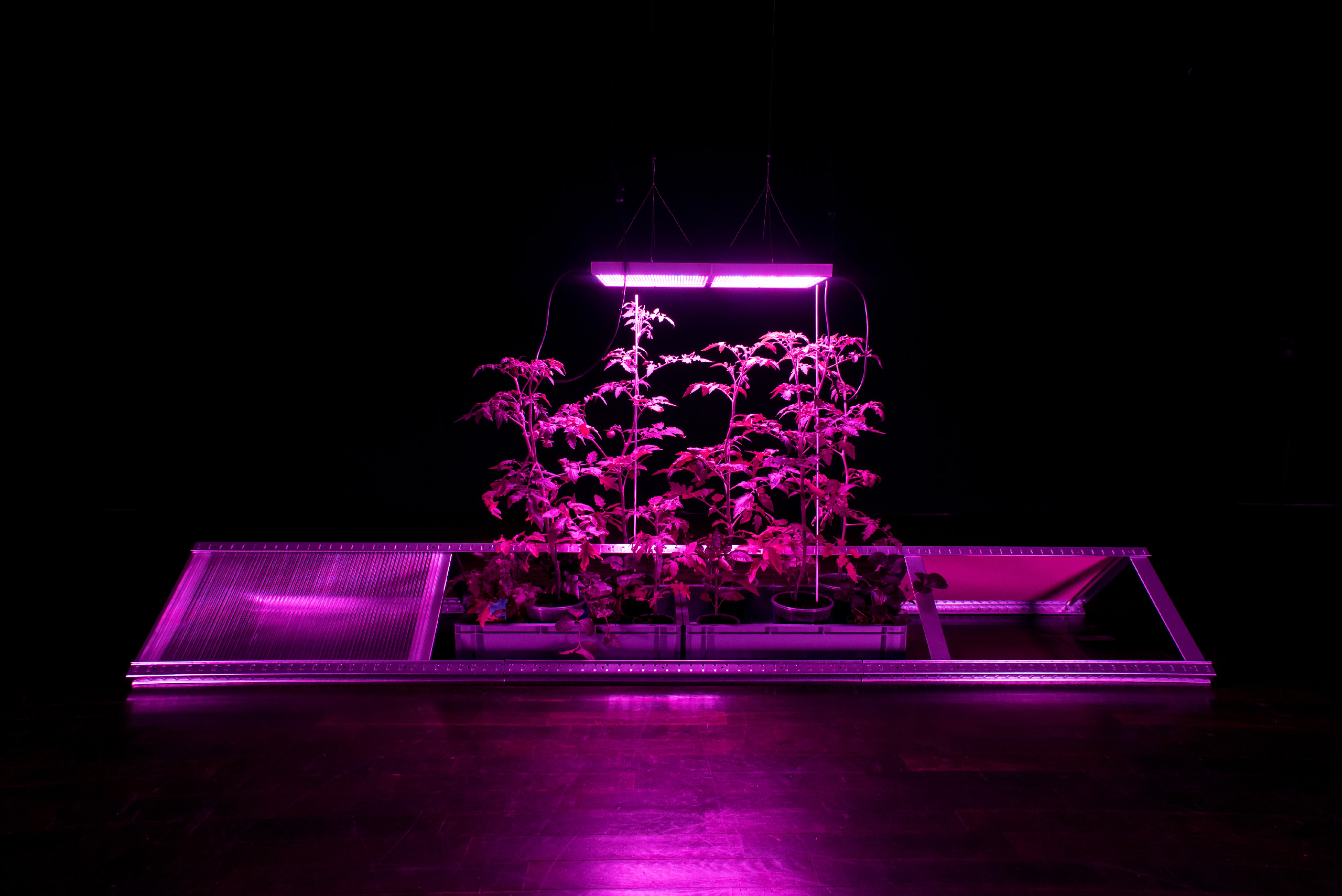 Within the group of artworks, cheap, readily purchasable but deconstructed bookshelves refer to the symbolic forms of knowledge preservation, which thereby appear as a sort of rethought modular system. The wavelength of the light emitted by the lamps is identical to the energy of sunlight promoting plant growth.