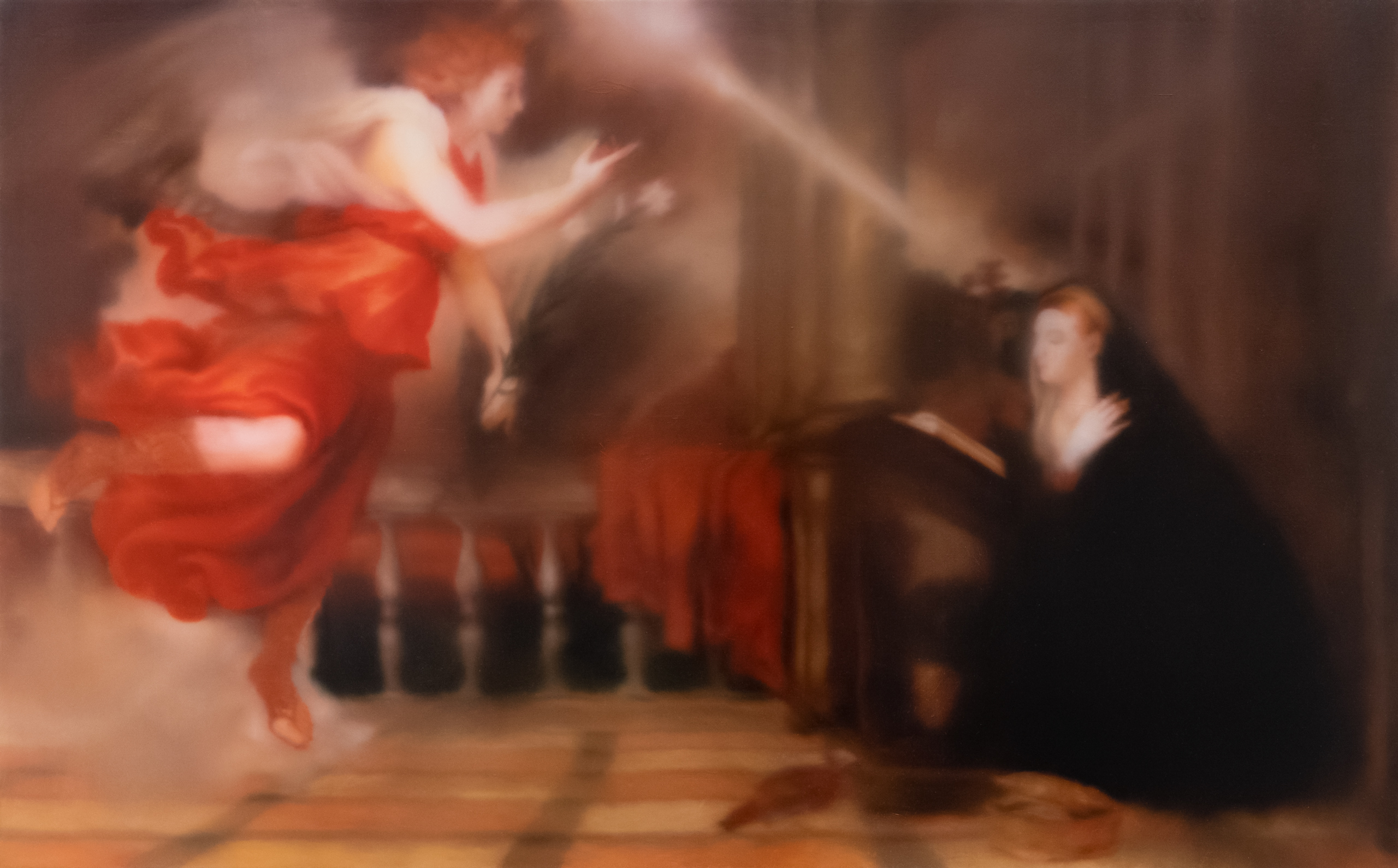 Gerhard Richter: Angyali üdvözlet Tiziano után (Verkündigung nach Tizian, CR: 344-1), 1973, olaj, vászon, 150×250 cm | Angyali üdvözlet Tiziano után (Verkündigung nach Tizian, CR: 344-2), 1973, olaj, vászon, 150×250 cm | Angyali üdvözlet Tiziano után (Verkündigung nach Tizian, CR: 344-3), 1973, olaj, vászon, 150×250 cm | Angyali üdvözlet Tiziano után (Verkündigung nach Tizian, CR: 343-2), 1973, olaj, vászon, 125×200 cm | Angyali üdvözlet Tiziano után (Verkündigung nach Tizian), 2015, No. P12, Giclée nyomat diasecen, alumínium kompozit lemez, 125×200 cm