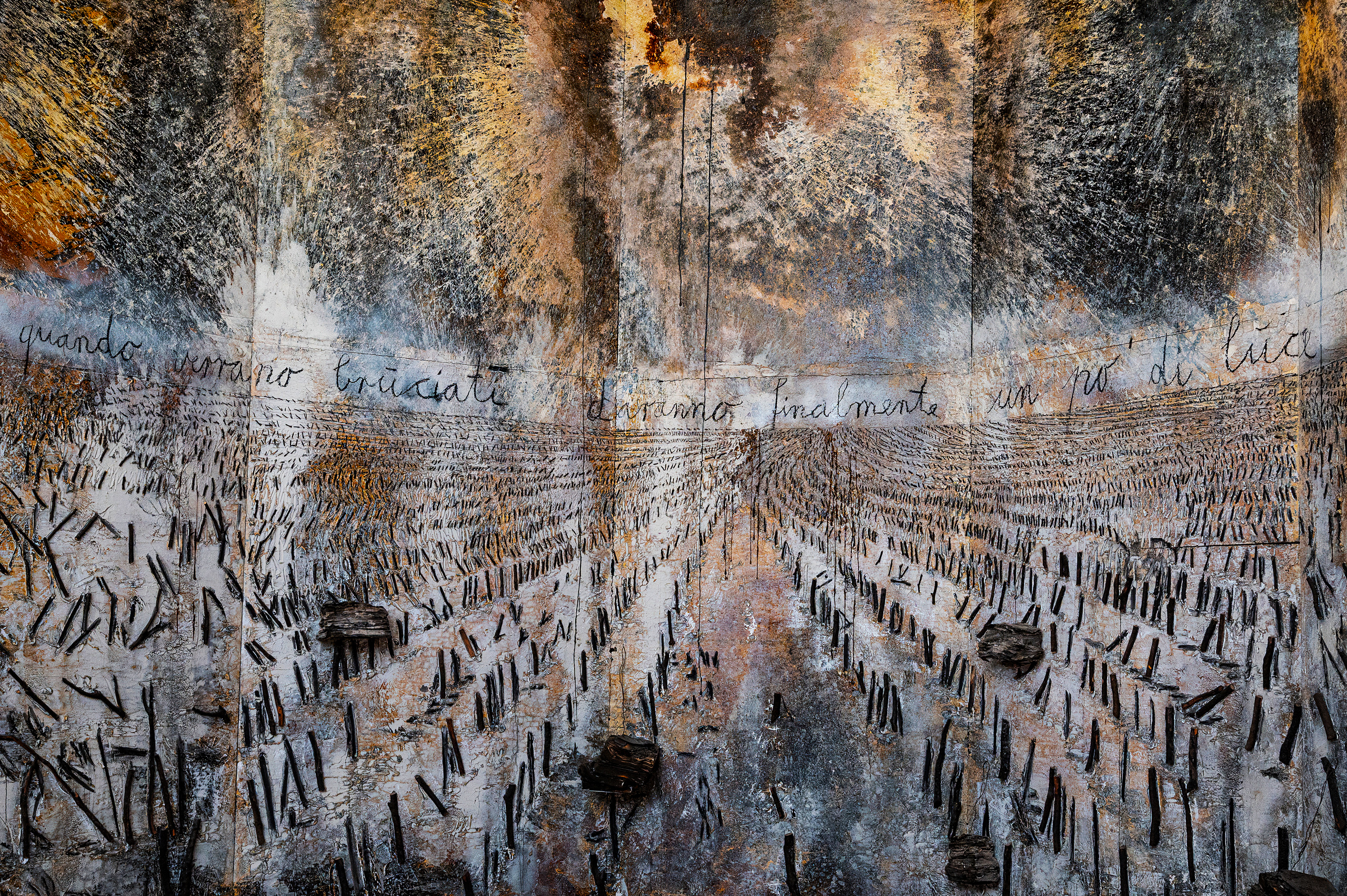 Questi scritti, quando verranno bruciati, daranno finalmente un po’ di luce, 2020–2021, emulzió, akril, olaj, sellak, aranylemez, ólom, fémhuzal, égett fa, szövet, föld, vászon, 840 × 1520 cm