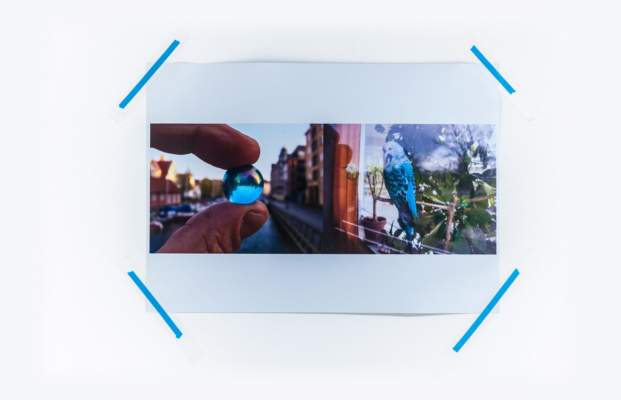 A Kék golyó, kék madár című képpár is Koppenhágában és Malmöben készült. A bal oldali, koppenhágai képen a művész kezében egy kék üveggolyót tart, a jobb oldalin a malmői lakás Rita nevű kék hullámos papagája latható. A cím és a képeken domináns azonos árnyalatú kék szín, sőt, az üveggolyó és a kék madár szimbolikus jelentése (mindkettő a vágy jelképe) a két kép azonosságára utal. De az azonosságokban megjelenik a különbség is. Amíg az üveggolyó távolság, az ismeretlen utáni vágy, addig a kék madár a megálmodott boldogság. A pasztellrajz a malmöi fotó felett a golyó és a madár formáját ismétli, a nagyításnak köszönhetően azonban a madár postássapkával a fején antropomorf.